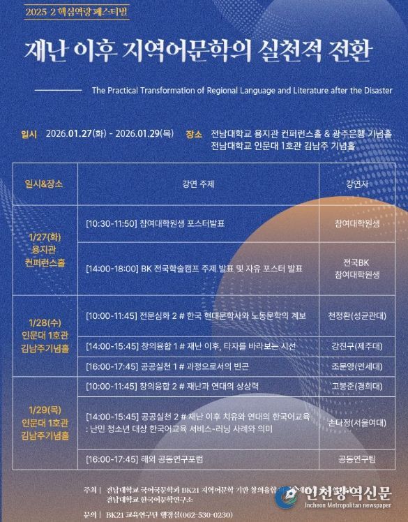 [인천광역신문] 박진 기자 | 전남대학교 국어국문학과 BK21 FOUR 교육연구단이 오는 1월 27일부터 29일까지 3일간 핵심역량페스티벌을 개최한다.