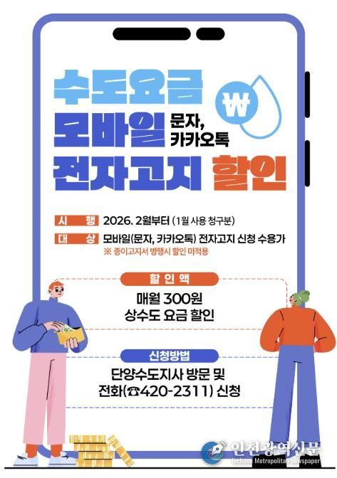 [인천광역신문] 박진 기자 | 단양군은 종이 고지서 발송에 따른 행정비용과 환경 부담을 줄이고, 군민의 요금 납부 편의성을 높이기 위해 수도요금 모바일(문자·카카오톡) 전자고지 할인 제도를 오는 2월부터 시행한다고 밝혔다.