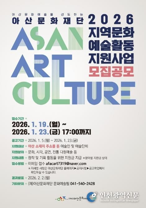 [인천광역신문] 박진 기자 | (재)아산문화재단은 지역 예술인의 안정적인 창작 환경을 조성하고 문화예술 생태계의 전문성을 강화하기 위해 ‘2026 지역문화예술 활동지원사업’ 공모를 시작한다.