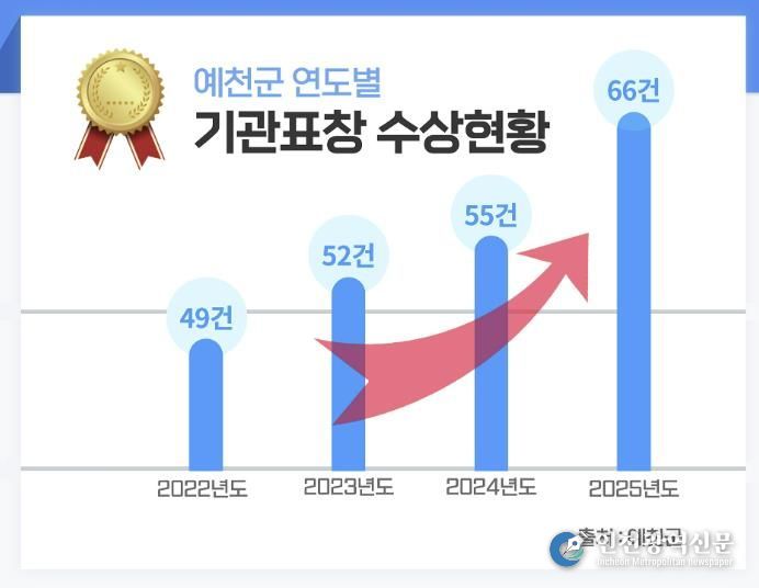 [인천광역신문] 박진 기자 | 예천군은 2025년 한 해 동안 중앙·광역·민간 평가 전반에서 우수한 성과를 거두며 총 66건의 기관 표창을 수상했다고 밝혔다.