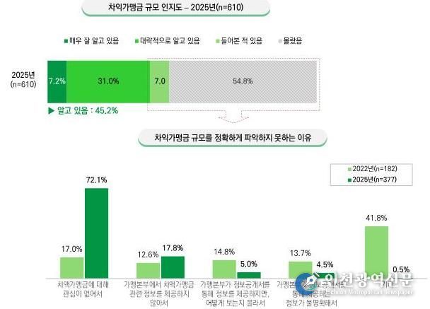 가맹본부 122개와 도내 가맹점주 610개를 대상으로 조사한 결과, 가맹금 유형 중 정기적인 로열티를 납부한다는 응답이 33.8%로 가장 높았으며, 차액가맹금 방식도 2025년 20.5%로 나타났다. 이는 2022년 실시한 실태조사 당시 3.2%였던 것과 비교해 큰 폭으로 상승한 수치다.