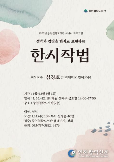 [인천광역신문] 박진 기자 | 원주시 중천철학도서관은 어르신을 위한 인문 프로그램으로 한시를 통해 생각과 감정을 표현하는 ‘한시작법’ 강좌를 운영한다.
