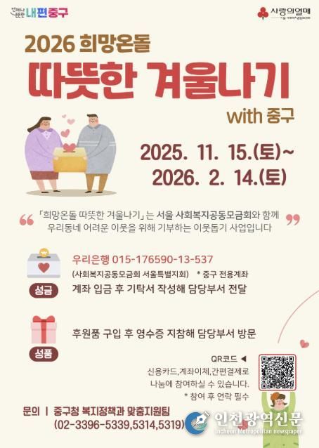 [인천광역신문] 박진 기자 | 서울 중구가 지난해 11월 15일부터 사회복지공동모금회와 함께 진행 중인‘2026 희망온돌 따뜻한 겨울나기’사업에 지난 1월 13일 기준, 구의 목표 모금액의 약 69%인 12억1천여만원의 성금·품이 모였다고 밝혔다. 구는 설 명절을 앞두고 있는 만큼 목표액을 달성할 수 있을 것으로 내다보고 있다.