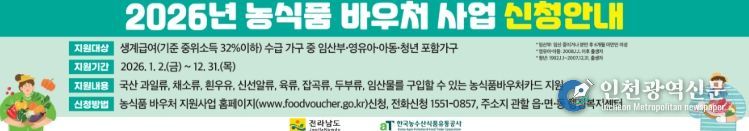 [인천광역신문] 박진 기자 | 전라남도는 생계급여 수급 가구를 대상으로 식료품 구입 부담을 덜어주고, 지속 가능한 농식품 소비 기반을 확충하기 위해 농식품 바우처 지원사업을 추진한다.