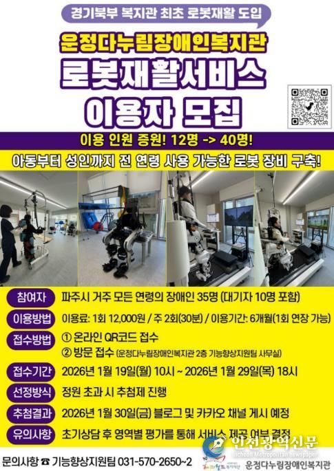 [인천광역신문] 박진 기자 | 파주시는 운정다누림장애인복지관의 로봇 재활치료 서비스 강화를 위해 치료 종사자를 증원하고 관련 장비를 추가 설치함으로써 재활치료 이용 대상을 대폭 확대한다.