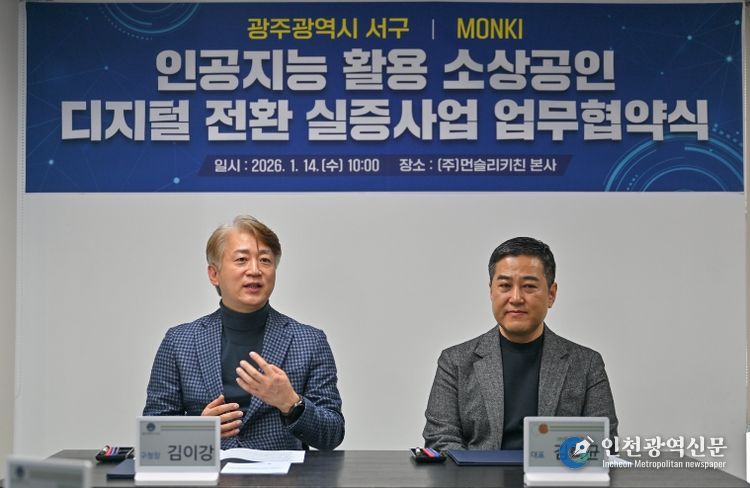 서구는 14일 서울 강남구에 위치한 외식 디지털 솔루션 기업 ㈜먼슬리키친(대표 김혁균) 본사에서 ‘인공지능 활용 소상공인 디지털 전환 실증사업 추진을 위한 업무협약’을 체결했다.