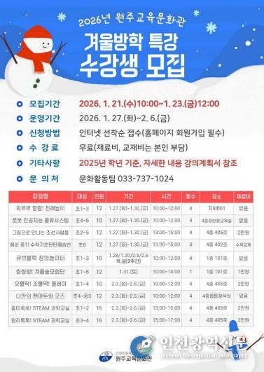 [인천광역신문] 박진 기자 | 원주교육문화관(관장 용석태)은 1월 21일부터 23일까지 관내 초·중학생을 대상으로 겨울방학 특강 수강생을 모집한다.
