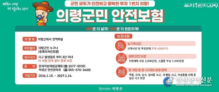 [인천광역신문] 박진 기자 | 의령군은 일상생활 중 예기치 못한 재난과 사고로부터 군민의 생활 안정을 지원하기 위해 ‘2026년 군민안전보험’에 갱신 가입하고, 1월 15일부터 본격 운영에 들어간다고 밝혔다.