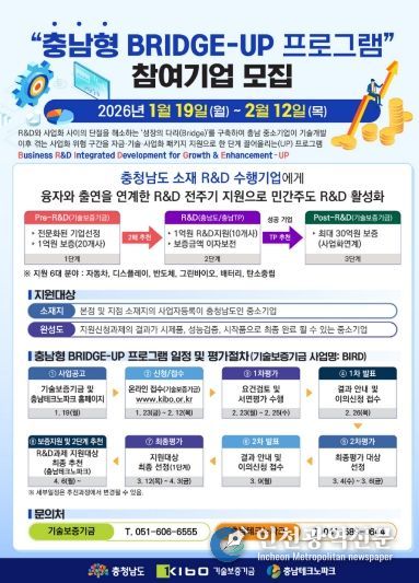 [인천광역신문] 박진 기자 | 충남도는 기술보증기금, 충남테크노파크와 함께 소부장·중소기업 성장 지원을 위한 충남형 기업 맞춤 지원사업(BRIDGE-UP 프로그램)을 추진한다고 14일 밝혔다.