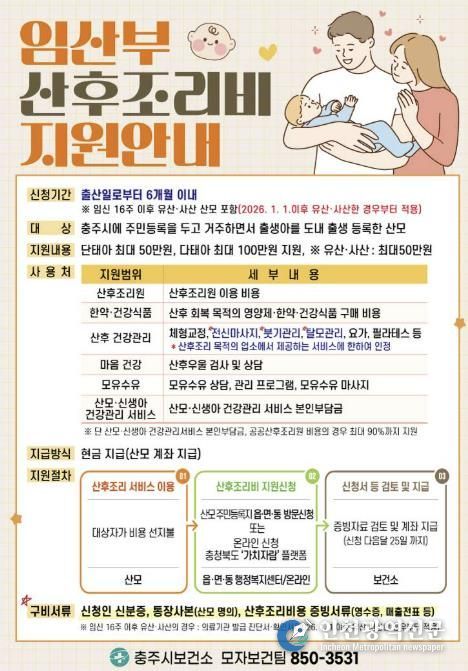 [인천광역신문] 박진 기자 | 충주시는 출산과 양육에 대한 부담을 완화하고 산모의 신체적·정신적 회복을 지원하기 위해 산후조리비 지원 대상과 신청 방식을 확대한다고 15일 밝혔다.
