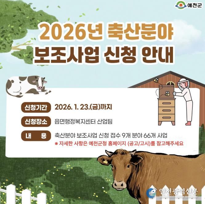 [인천광역신문] 박진 기자 | 예천군은 2026년도 축산 7개 분야 66여 개의 보조사업에 대해 23일까지 읍‧면 행정복지센터에서 신청을 받는다고 밝혔다.