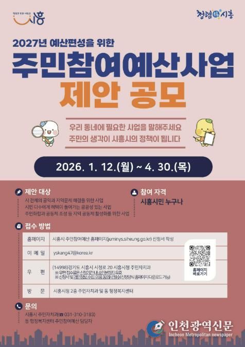 [인천광역신문] 박진 기자 | 시흥시는 오는 4월 30일까지 주민들이 직접 사업을 제안하는 ‘시흥시 주민참여예산 제안’을 신청받는다.
