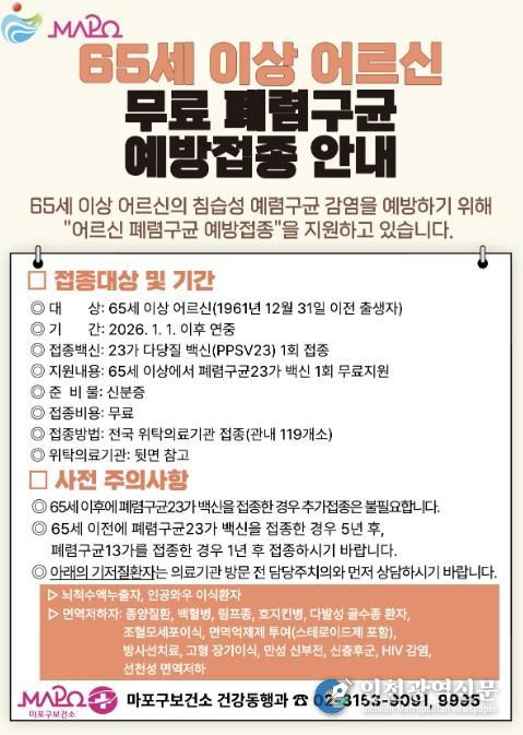 [인천광역신문] 박진 기자 | 마포구는 65세 이상 어르신의 침습성 폐렴구균 감염을 예방하고 건강한 노후를 지원하기 위해 연중 ‘어르신 폐렴구균 예방접종’을 1회 무료로 실시한다.