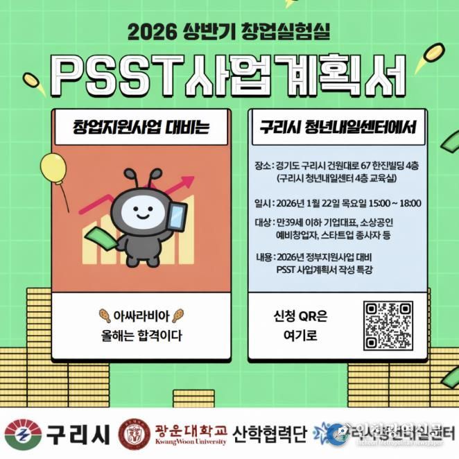 이번 프로그램은 2026년 대형 정부 창업지원 사업을 대비한 PSST 전략 사업계획서 작성 특강으로, 실질적인 창업 역량 강화를 목표로 기획됐다. 특강은 1월 22일(목) 오후 3시부터 6시까지 운영되며, 관내 청년 예비창업가와 기업 대표, 소상공인 등을 대상으로 사업계획서 작성 비법과 맞춤형 조언을 중심으로 한 실전형 교육으로 진행될 예정이다.