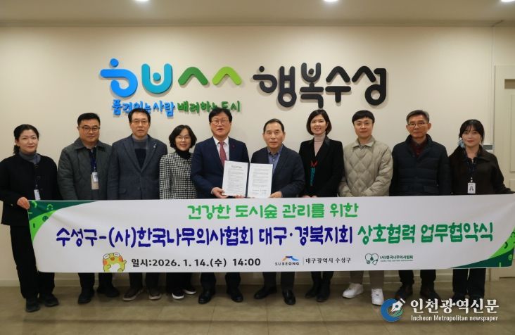 [인천광역신문] 박진 기자 | 대구 수성구와 (사)한국나무의사협회 대구경북지회(회장 양헌석)는 지난 14일 공원녹지 및 도시숲을 건강하게 관리하기 위한 상호 협력 업무협약을 체결했다.