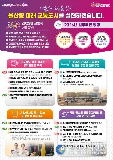 [인천광역신문] 박진 기자 | 울산시는 사람과 도시를 잇는 울산형 미래교통 도시 실현을 위해 2026년 교통 분야 정책 방향을 수립하고 추진에 나선다고 밝혔다.