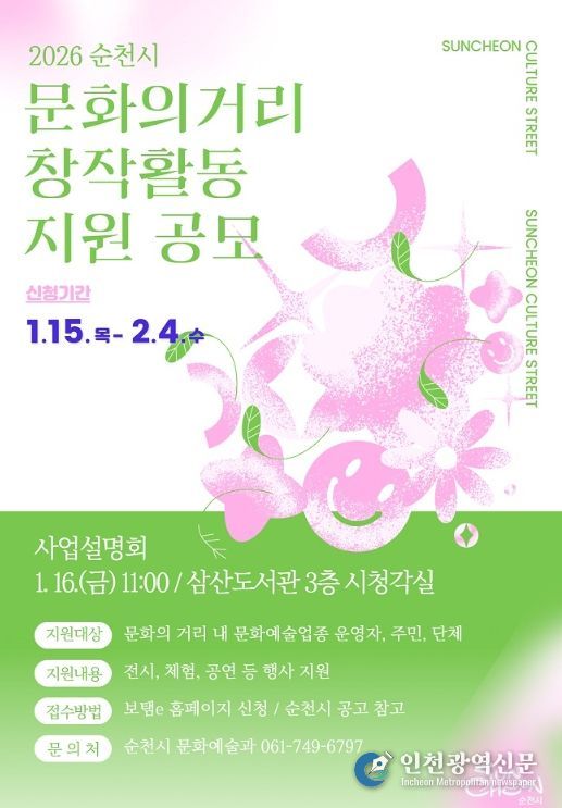 [인천광역신문] 박진 기자 | 순천시는 문화의 거리를 예술특화 거점지역으로 육성하고 지역 예술인의 지속가능한 창작활동을 지원하기 위해 ‘2026년 순천시 문화의 거리 창작활동 지원사업’ 참여자를 공개 모집한다고 밝혔다.