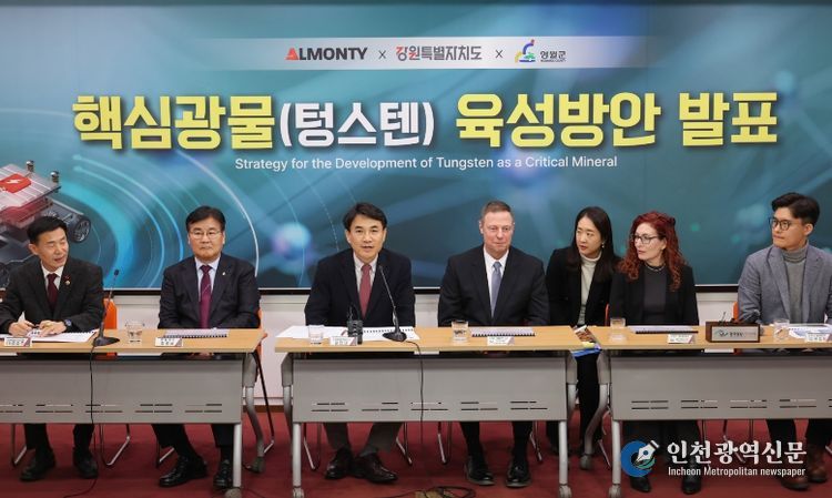 [인천광역신문] 박진 기자 | 김진태 강원특별자치도지사는 1월 15일, ㈜알몬티 인더스트리 최고운영책임자(COO)인 스티븐 알렌(Steven Allen), 최명서 영월군수 등과 함께 영월 상동 텅스텐 광산을 중심으로 한 핵심광물(텅스텐) 육성 방안을 발표했다.