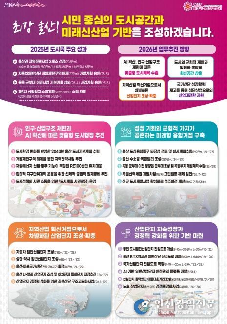 [인천광역신문] 박진 기자 | 울산시가 ‘최강 울산!’ 완성을 위한 시민 중심의 도시공간 조성과 미래 신산업 기반 구축을 목표로 2026년 도시 분야 정책을 추진한다.