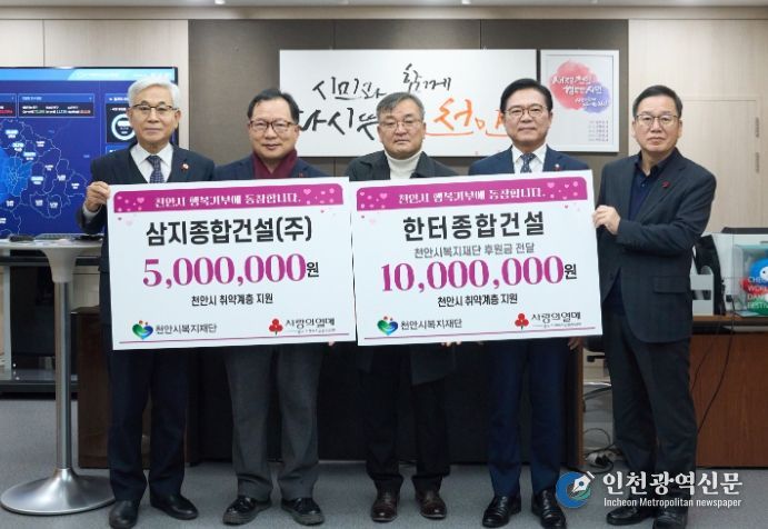 [인천광역신문] 박진 기자 | (재)천안시복지재단은 15일 ㈜한터종합건설·삼지종합건설㈜이 취약계층을 위한 후원금 1,500만 원을 기탁했다고 밝혔다.