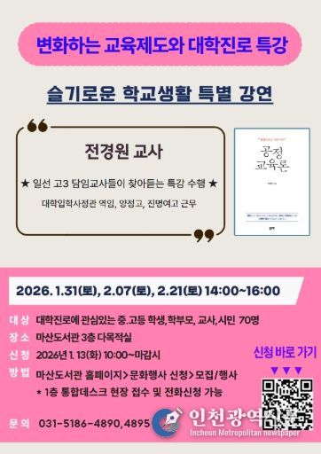 [인천광역신문] 박진 기자 | 김포시 마산도서관이 1월 31일, 2월 7일, 2월 21일 2월 21일 3회에 걸쳐 오후 2시부터 4시까지 ‘변화하는 교육환경(슬기로운 학교생활)’에 관심이 있는 중고등학교 학부모, 교사, 학생 등 김포시민을 대상으로 특별강연을 운영한다.