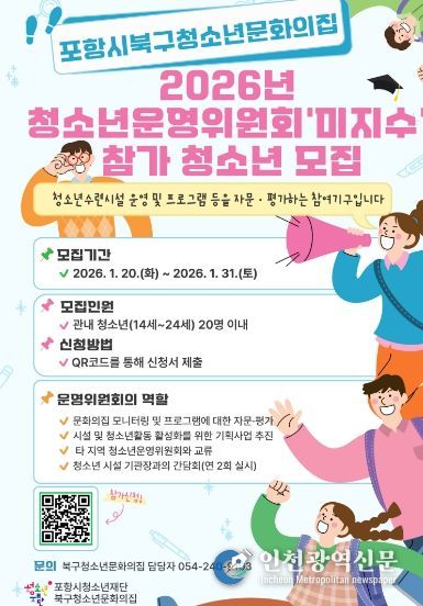 [인천광역신문] 박진 기자 | 포항시청소년재단 북구청소년문화의집은 오는 20일부터 31일까지 청소년운영위원회 ‘미지수’ 참가 청소년을 모집한다.