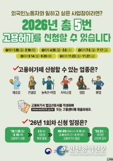 [인천광역신문] 박진 기자 | 고용노동부는 구인난을 겪는 기업이 이주노동자(E-9)를 고용할 수 있도록 ‘26년도에도 5차례 신규 고용허가 신청․접수를 진행할 예정이라고 밝혔다.