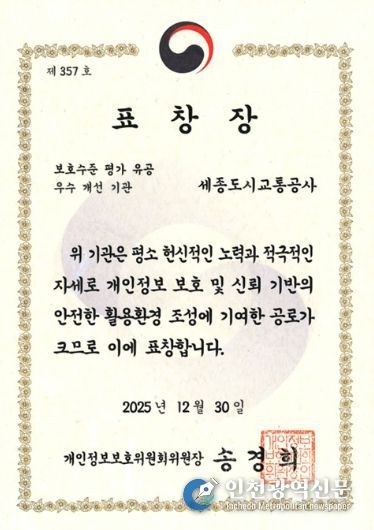 [인천광역신문] 박진 기자 | 세종도시교통공사(사장 도순구)는 개인정보보호위원회가 주관한 ‘2024년 공공기관 개인정보 보호수준 평가’에서 ‘우수 개선 기관’으로 선정되어 위원장 표창을 받았다고 밝혔다.