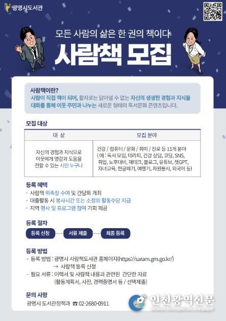 시는 책으로는 접하기 어려운 개인의 경험과 지혜를 이웃과 공유하는 ‘광명시 사람책’을 오는 2월 28일까지 모집한다고 16일 밝혔다. 올해는 시민이 직접 주변의 숨은 전문가를 추천하는 ‘사람책 이웃추천제’를 새롭게 도입한다.