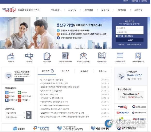 [인천광역신문] 박진 기자 | 서울 용산구가 2026년에도 ‘맞춤형 입찰정보시스템’을 운영해 지역 내 중소기업·소상공인이 관심 분야의 공공입찰 정보를 빠르고 정확하게 받아볼 수 있도록 지원한다. 정보 탐색 부담을 줄이고 공공조달 참여를 촉진해 지역 기업들의 판로를 개척하고 지역경제를 활성화하기 위한 취지다.