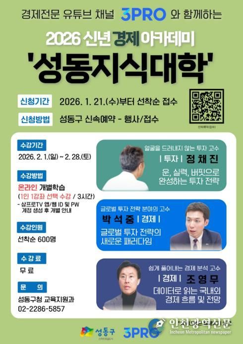 [인천광역신문] 박진 기자 | 서울 성동구는 새해를 맞아 투자, 경제 분야 전문 온라인 강좌를 무료로 들을 수 있는 신년 경제 아카데미 ‘성동지식대학’을 운영한다고 밝혔다.
