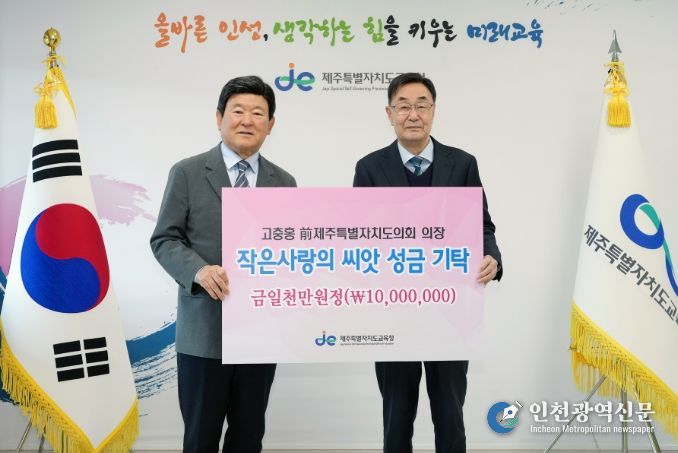 [인천광역신문] 박진 기자 | 제주도교육청은 고충홍 前 제주특별자치도의회 의장이 14일 ‘작은 사랑의 씨앗’ 성금 1000만 원을 교육청에 기탁했다고 밝혔다.