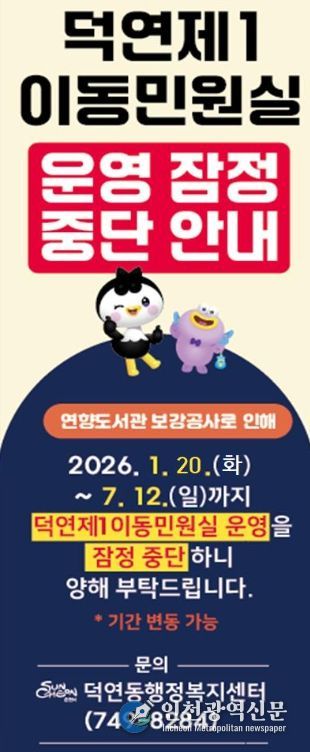 [인천광역신문] 박진 기자 | 순천시 덕연동행정복지센터는 연향도서관 내에 운영 중인 덕연동 제1이동민원실이 도서관 내진성능 보강공사 시행에 따라 오는 1월 20일부터 7월 12일까지 운영을 잠정 중단한다고 밝혔다.