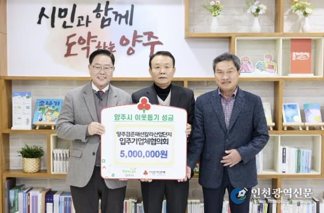 [인천광역신문] 박진 기자 | 양주시가 지난 15일 시장실에서 양주검준패션칼라사업협동조합을 비롯한 관련 단체 및 기업으로부터 이웃돕기 성금과 성품을 기탁받았다고 밝혔다.