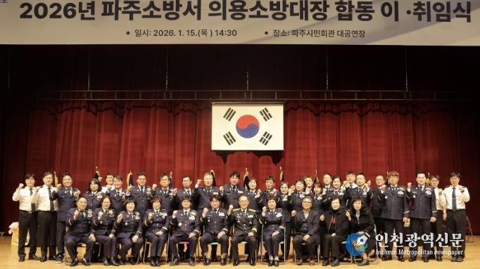 [인천광역신문] 박진 기자 | 파주소방서는 1월 15일 파주시민회관 대공연장에서 『2026년 파주소방서 의용소방대 대장 합동 이·취임식』을 열고, 지역 안전을 위해 헌신해온 이임 대장들의 공로에 감사를 전하는 한편, 새로운 리더들과 함께 ‘의용’의 사명을 이어갈 뜻을 다졌다.