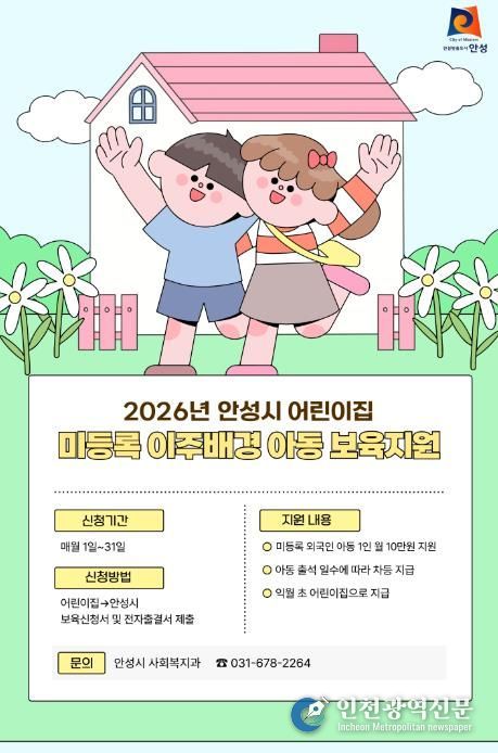 [인천광역신문] 박진 기자 | 안성시는 2026년부터 어린이집에 다니는 미등록 외국인(이주배경) 영유아에게 월 10만원의 보육지원금을 지원한다고 밝혔다.