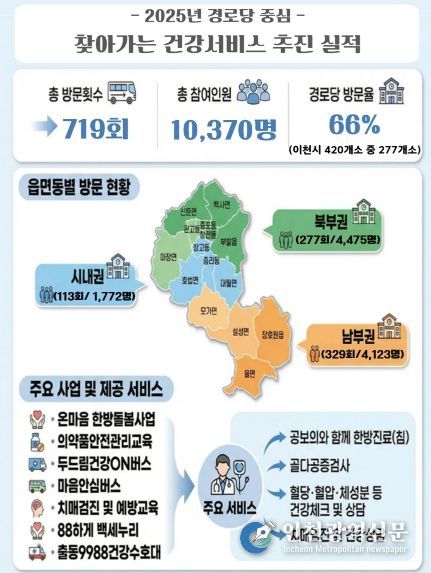 분석 결과, 2025년 한 해 동안 경로당 277개소를 총 719회 순회하여 10,370명의 어르신에게 한방진료, 골밀도 측정, 건강상담, 치매검진, 운동교실 등 다양한 건강관리서비스를 제공했다. 이는 이천시 전체 경로당의 66%(277개소)에 달하는 수치다.