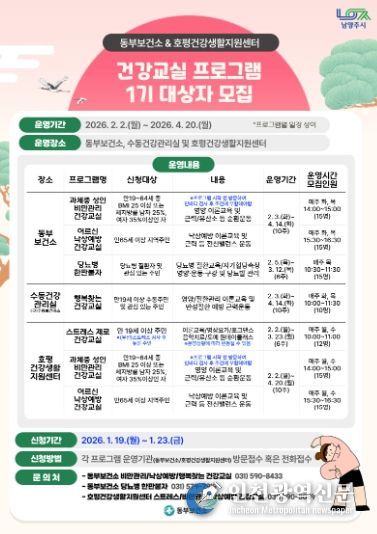 [인천광역신문] 박진 기자 | 남양주시는 오는 1월 19일부터 23일까지 호평건강지원센터에서 ‘건강교실 프로그램’ 1기 참여자를 모집한다고 밝혔다.