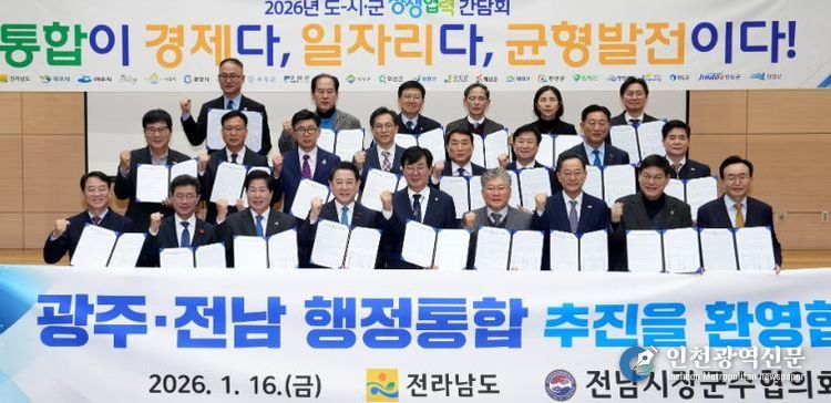 [인천광역신문] 박진 기자 | 전라남도는 16일 전남도청 왕인실에서 ‘2026년 도-시군 상생협력 간담회’를 열어 지역 대도약을 위한 광주·전남 행정통합 추진에 도와 22개 시군이 공동 보조를 맞추기로 했다.