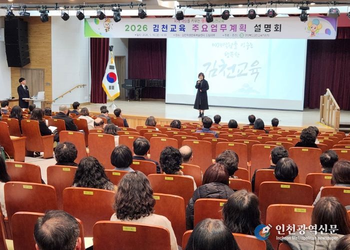 [인천광역신문] 박진 기자 | 경상북도김천교육지원청은 1월 16일 김천학생문화예술센터 드림마루에서 관내 유‧초‧중‧고‧각종학교 교(원)장 및 학교운영위원장, 학부모 회장 등 150여 명을 초청하여 2026 김천교육 주요업무계획 설명회를 개최했다.