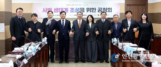 인천시의회는 16일 의회운영위원회 회의실에서 정해권 의장을 비롯해 이단비·신충식 의원, 토론자, 언론계, 사법·법률 분야 전문가, 학계, 시민단체 등 50여 명이 참석한 가운데 ‘법률 중심 도시 육성에 관한 발전 방향’이라는 주제로 ‘사법 생태계 조성을 위한 공청회’를 개최했다.