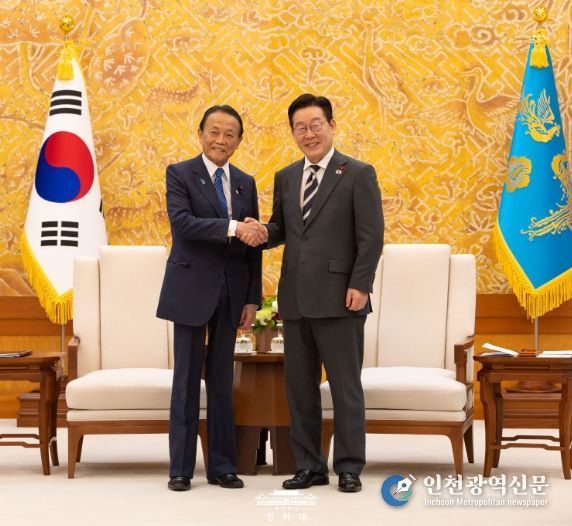 [인천광역신문] 박진 기자 | 이재명 대통령은 16일 16시부터 약 30분간 '서울-도쿄 포럼' 참석차 방한한 아소 다로(麻生 太郎) 전 일본 총리를 접견하고, 이번 주 진행된 나라(奈良) 방문(1.13.-14.)과 한일 정상회담 결과 등에 대해 이야기를 나누었다.