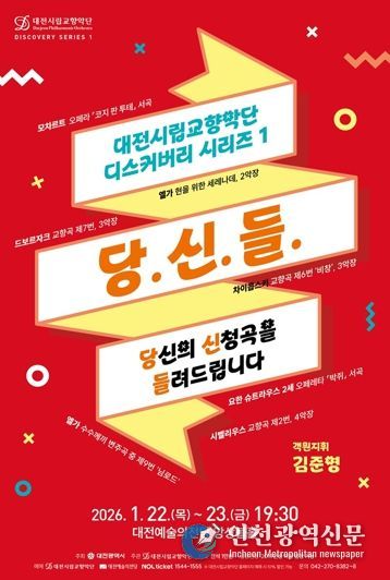 [인천광역신문] 박진 기자 | 대전시립교향악단은 22일과 23일 오후 7시 30분, 대전예술의전당 앙상블홀에서 디스커버리 시리즈1 <당.신.들. - 당신의 신청곡을 들려드립니다>를 무대에 올린다.