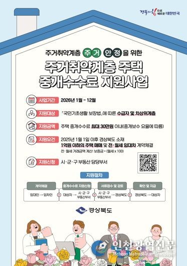 구비서류는 ▴수급자 증명서 또는 차상위계층 확인서 ▴주민등록등본 ▴매매·임대차 계약서 ▴중개수수료 영수증 ▴통장 사본 ▴개인정보 제공 동의서 등이며, 사업과 관련한 자세한 사항은 경상북도 누리집에서 확인할 수 있다.