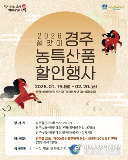 [인천광역신문] 박진 기자 | 경주시는 2026년 병오년 설을 맞아 1월 19일부터 2월 20일까지 ‘경주농특산물판매장 설맞이 특별할인 행사’를 진행한다고 18일 밝혔다.