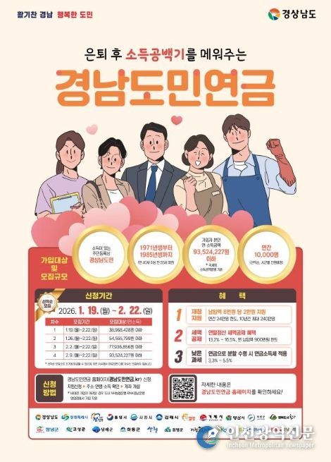 [인천광역신문] 박진 기자 | 경상남도는 도민의 소득 공백기 해소와 안정적인 노후 준비를 지원하기 위한 ‘경남도민연금’ 가입자 모집을 1월 19일부터 본격적으로 시작한다.