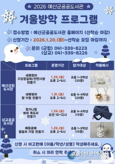 [인천광역신문] 박진 기자 | 예산군은 겨울방학을 맞아 관내 초등학생을 대상으로 오는 1월 24일과 31일 토요일 이틀간 공공도서관 겨울방학 프로그램을 운영한다.