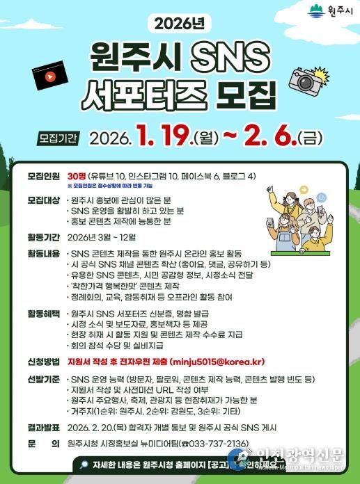 [인천광역신문] 박진 기자 | 원주시는 참신한 아이디어와 열정을 가진 ‘2026년 원주시 SNS 서포터즈’를 다음 달 6일까지 모집한다.