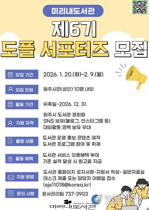 [인천광역신문] 박진 기자 | 원주시 미리내도서관은 오는 20일부터 올 한 해 도서관과 함께 할 ‘제6기 도플 서포터즈’를 모집한다.
