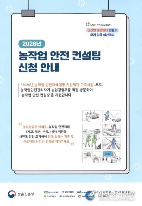 [인천광역신문] 박진 기자 | 안동시는 농업 분야 중대재해 예방과 안전한 농작업 환경 조성을 위해 '2026년 농작업 안전재해예방 지원체계 구축사업'의 일환으로 ‘농작업 안전보건관리 컨설팅’ 참여농가를 모집한다고 1월 16일(금) 밝혔다.